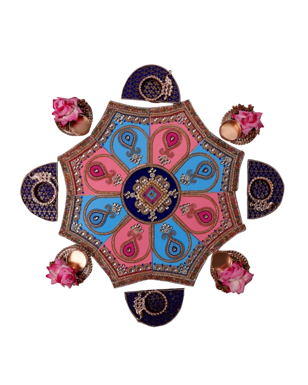 Add a regal touch to your festive décor with this Handcrafted Acrylic Rangoli Set, designed in an eye-catching pink and blue paisley pattern. Embellished with sparkling stones and intricate detailing, this decorative piece also features matching diya holders adorned with faux flowers, making it the perfect centerpiece for Diwali, Navratri, weddings, or pooja celebrations.