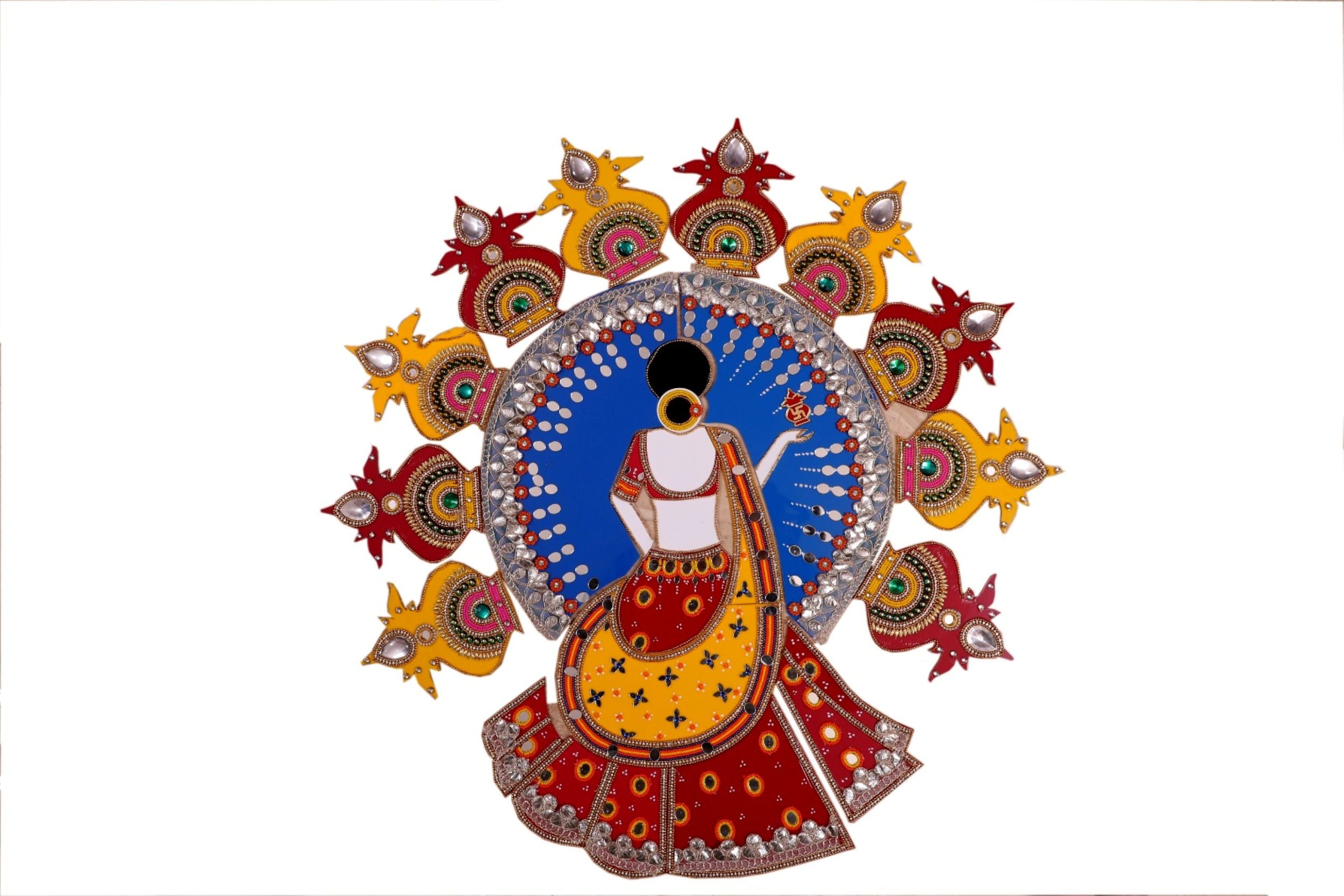 Celebrate Indian heritage with this stunning Handcrafted Acrylic Rangoli, featuring a traditional folk-style lady design, beautifully set against a vibrant blue background and surrounded by a multicolour Kalash-themed border. Expertly crafted using high-quality acrylic and decorated with intricate mirror work, beads, and vibrant colors like red, yellow, blue, and green, this rangoli is perfect for adding a festive and cultural touch to your home during Diwali, Navratri, Karwa Chauth, weddings, or poojas.
