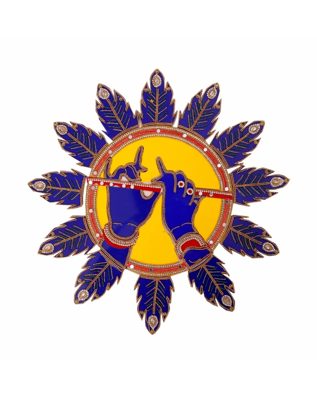 Celebrate devotion and artistry with this stunning Acrylic Rangoli featuring Krishna’s divine hands holding the flute in vibrant yellow and blue hues. Decorated with sparkling stones and embellishments, this rangoli radiates spiritual charm and festive beauty.