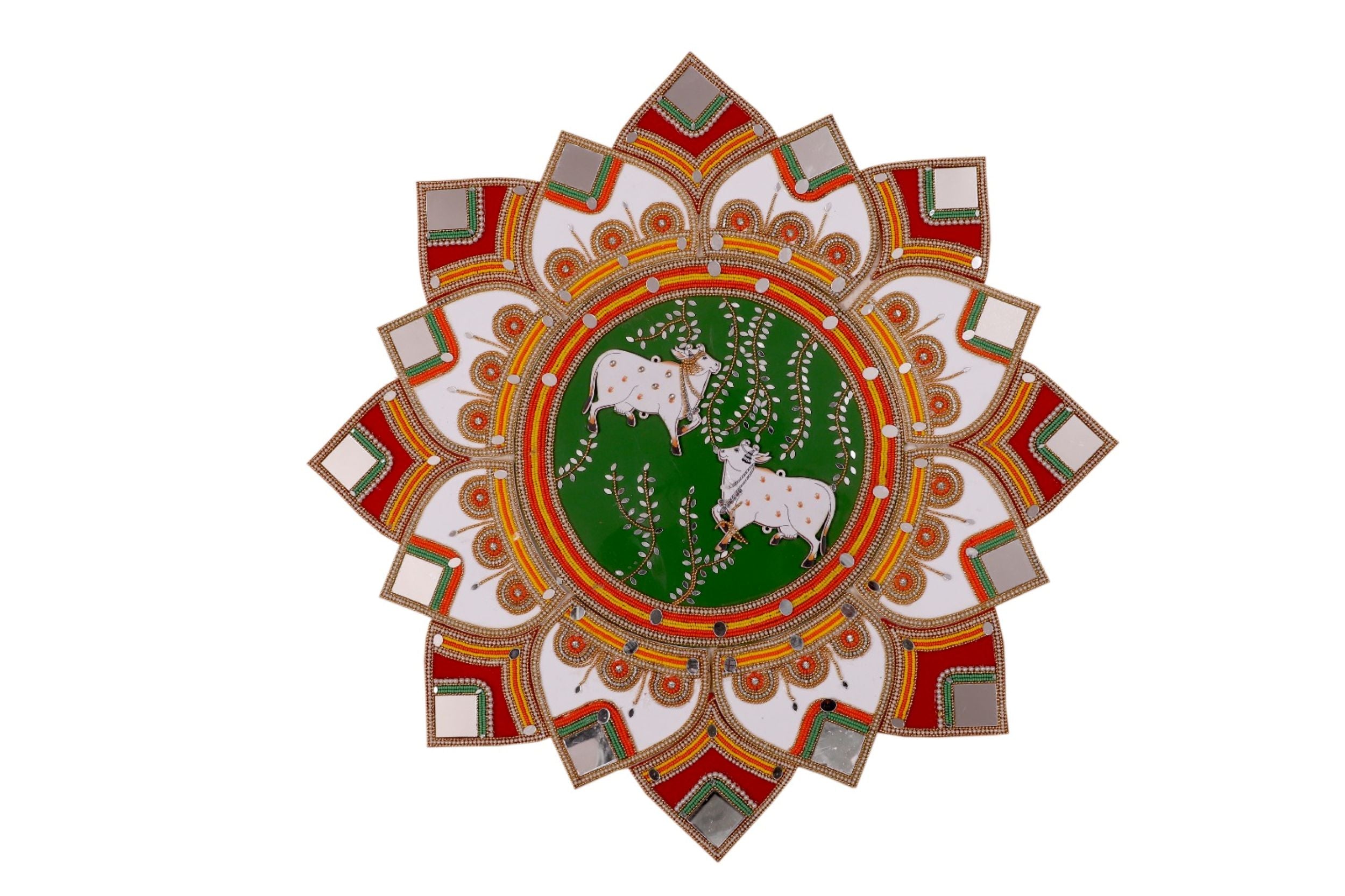 Elevate your festive décor with this Handcrafted Acrylic Rangoli, featuring a stunning central artwork of two sacred cows surrounded by intricate mandala patterns. Designed in vibrant hues of red, green, yellow, and white, this elegant rangoli brings a perfect blend of tradition and modern artistry to your home. Made from high-quality acrylic, this reusable rangoli is embellished with mirror work and colorful detailing, making it ideal for Diwali, Navratri, weddings, and other auspicious occasions.