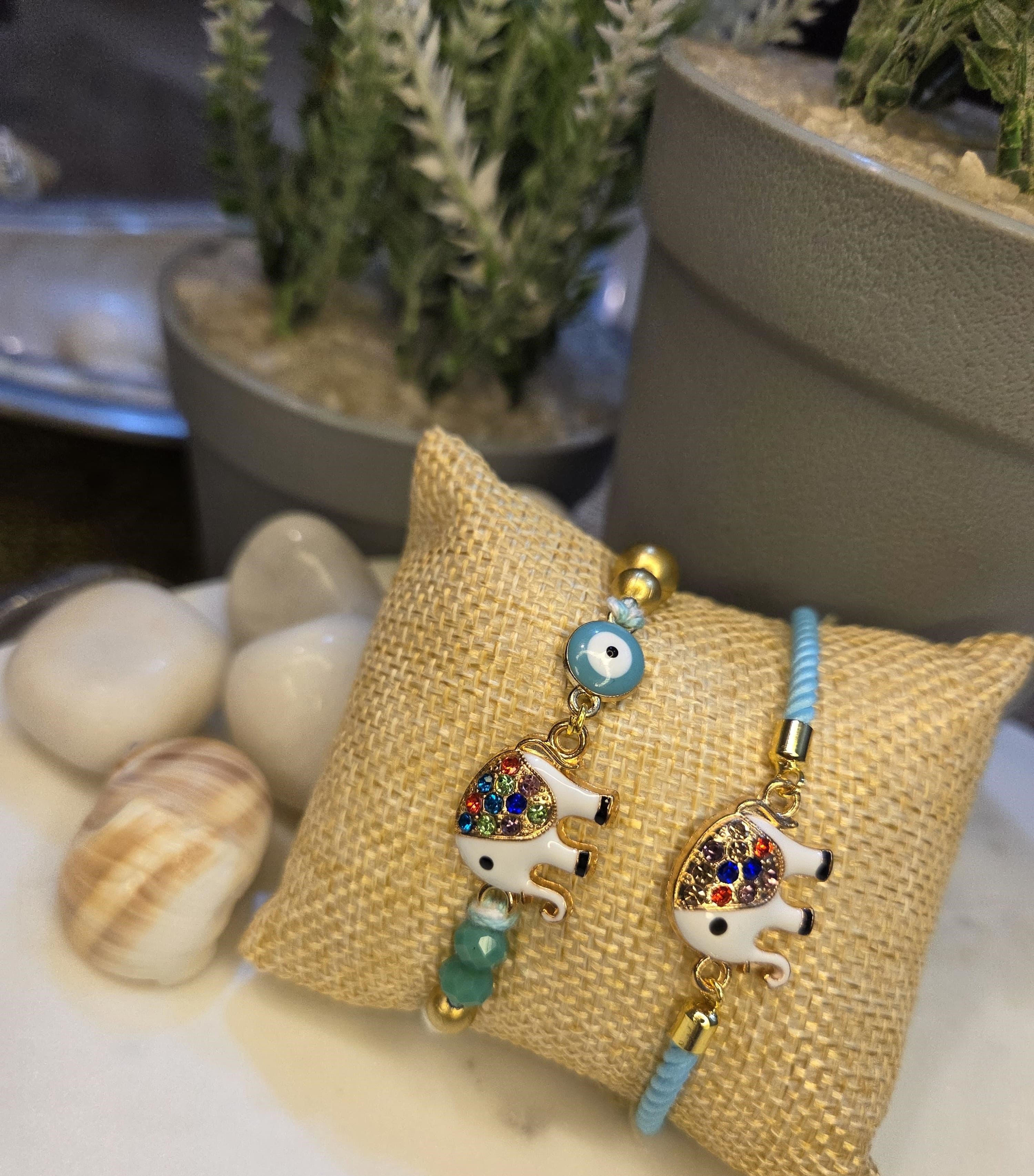 A charming white elephant charm pendant with sparkling details and a protective blue evil eye, ideal for gifting or daily wear