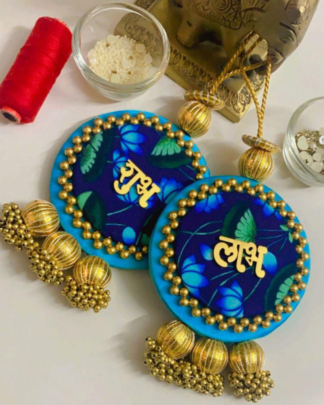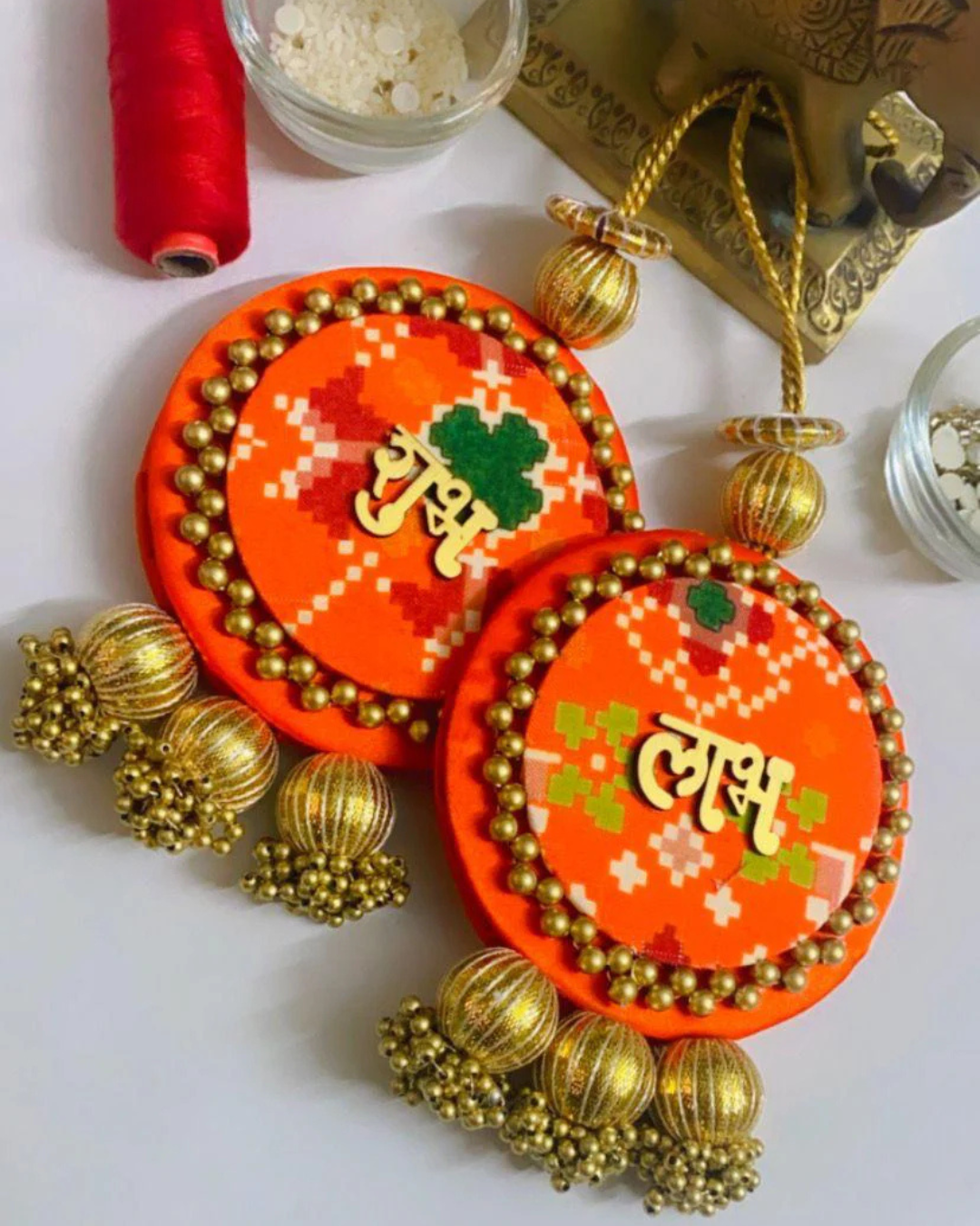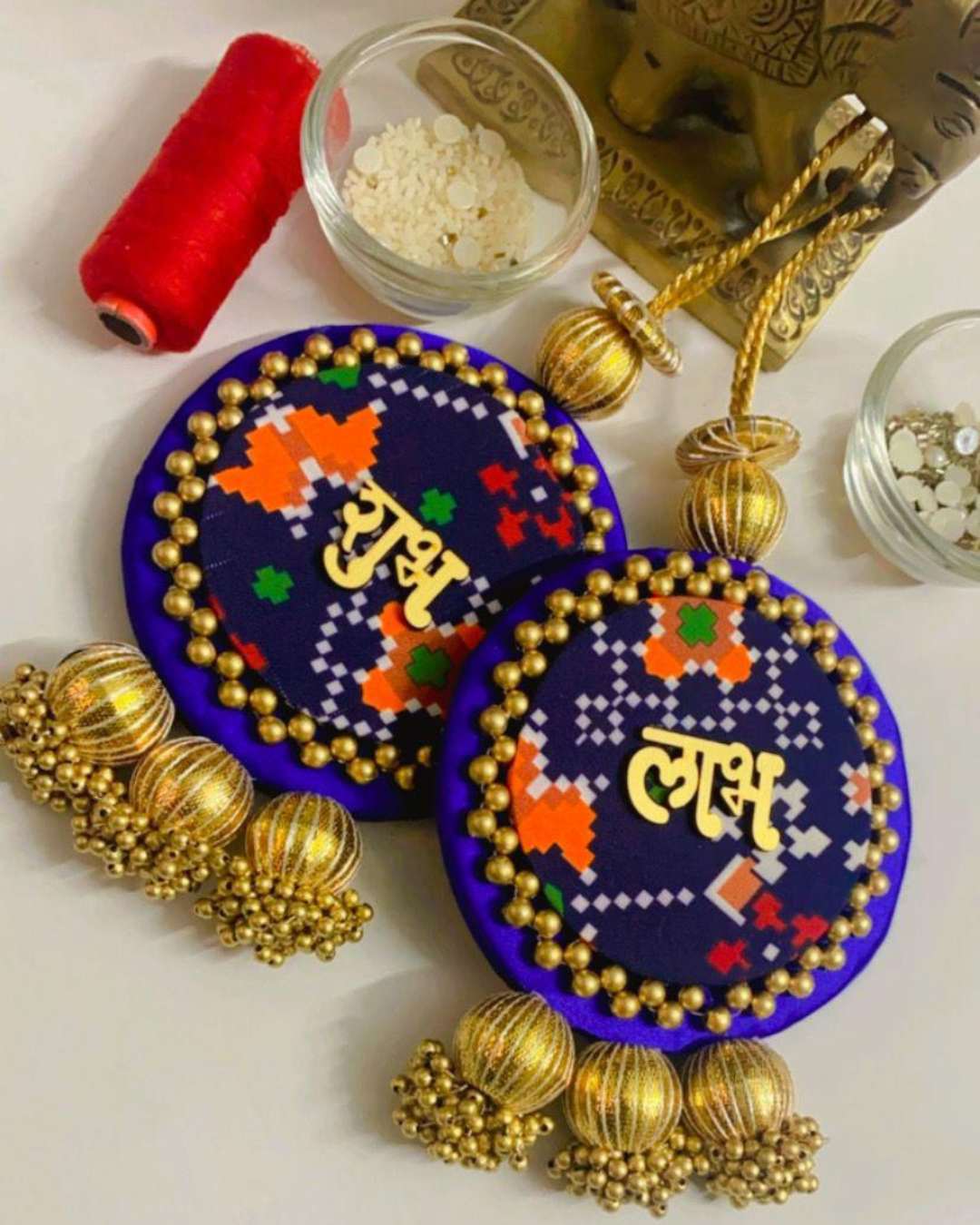 These auspicious "Shub Labh" wall hangings in vibrant colours, adorned with bandhani print, gold beadwork and traditional motifs are perfect for festive decor.