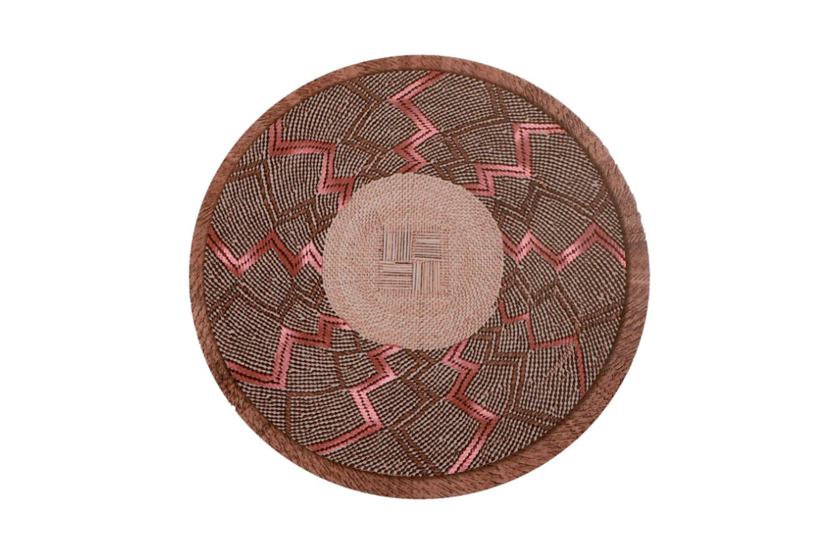 Elevate your table decor with this beautifully designed Set of 6 Geometric Round Table Mats, featuring a handwoven look with earthy browns and vibrant pink zigzag patterns.
