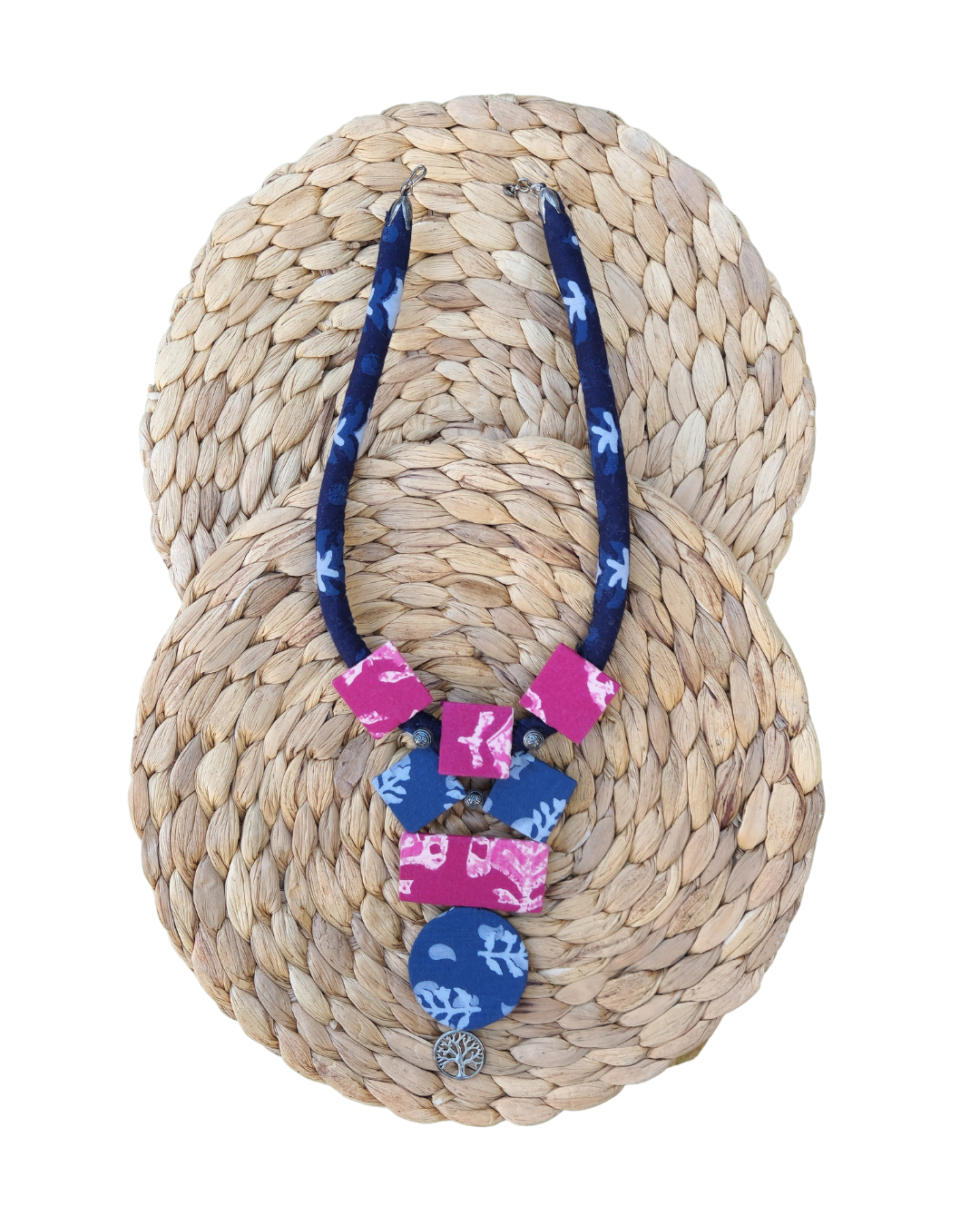 An elegant fabric necklace with delicate hand block print designs.
