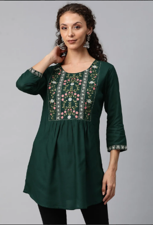 Stylish blue peplum kurta adorned with rich, colourful embroidery on the yoke, perfect for an elevated ethnic look.