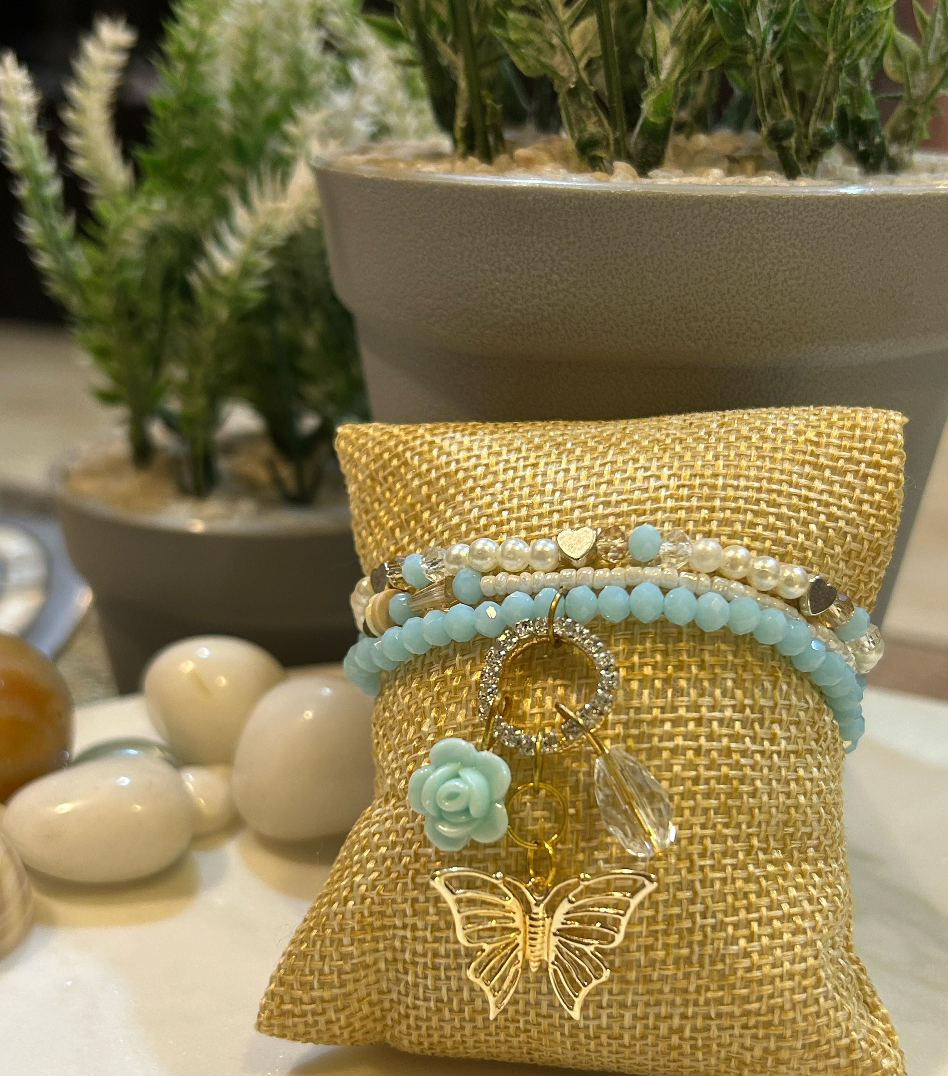 This charm bracelet combines elegance with fun through its multilayered beaded design and Butterfly charm. A statement piece that adds flair to any ocassion.