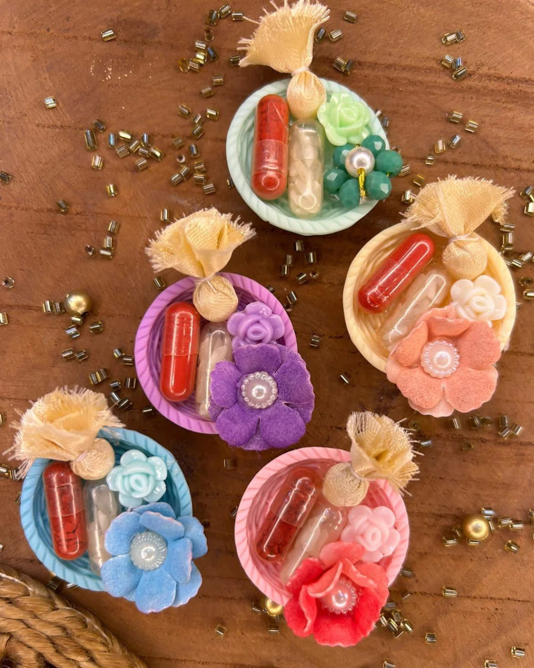 These charming miniature decorative pieces in assorted colours, feature roli chawal with delicate floral details, perfect for festive decor.