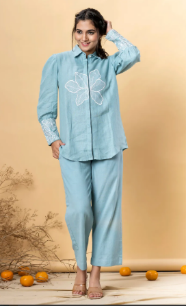 A charming matching set features a light blue collared top with subtle embroidery and comfortable coordinating pants, perfect for a relaxed elegance.