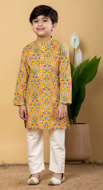 Fresh, cheerful, and effortlessly stylish — this Yellow Cotton Kurta with delicate floral prints paired with Off-White Pants makes for the perfect ethnic outfit i.