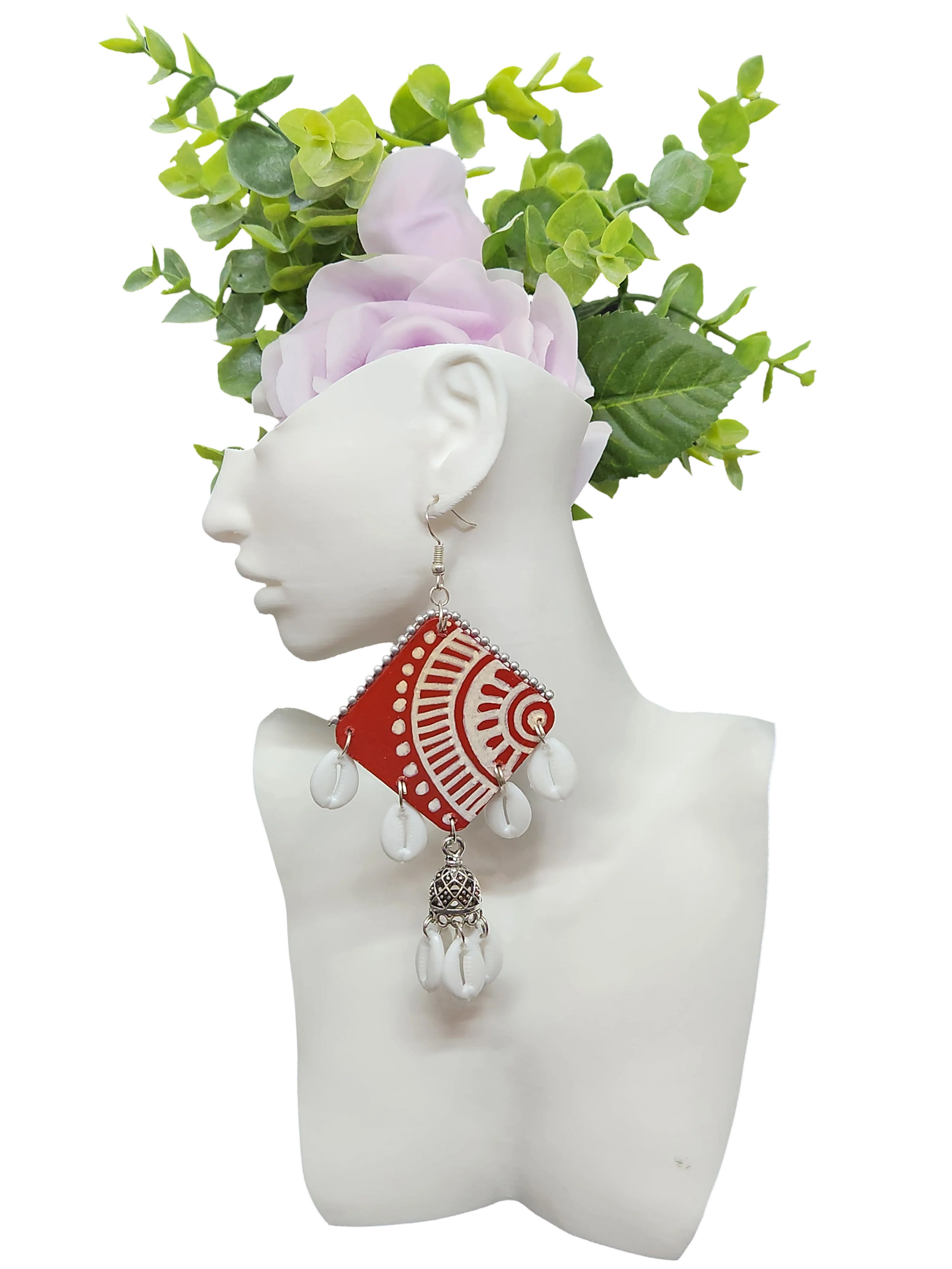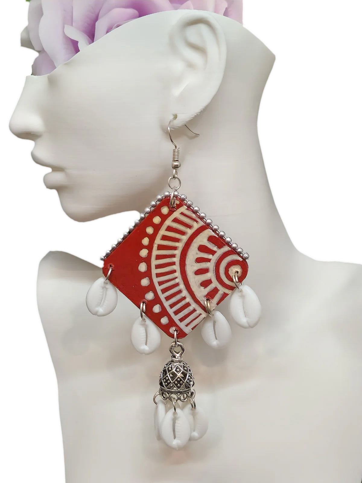Eye-catching handcrafted earrings with orange and white geometric patterns, cowrie shells, and white floral drops.