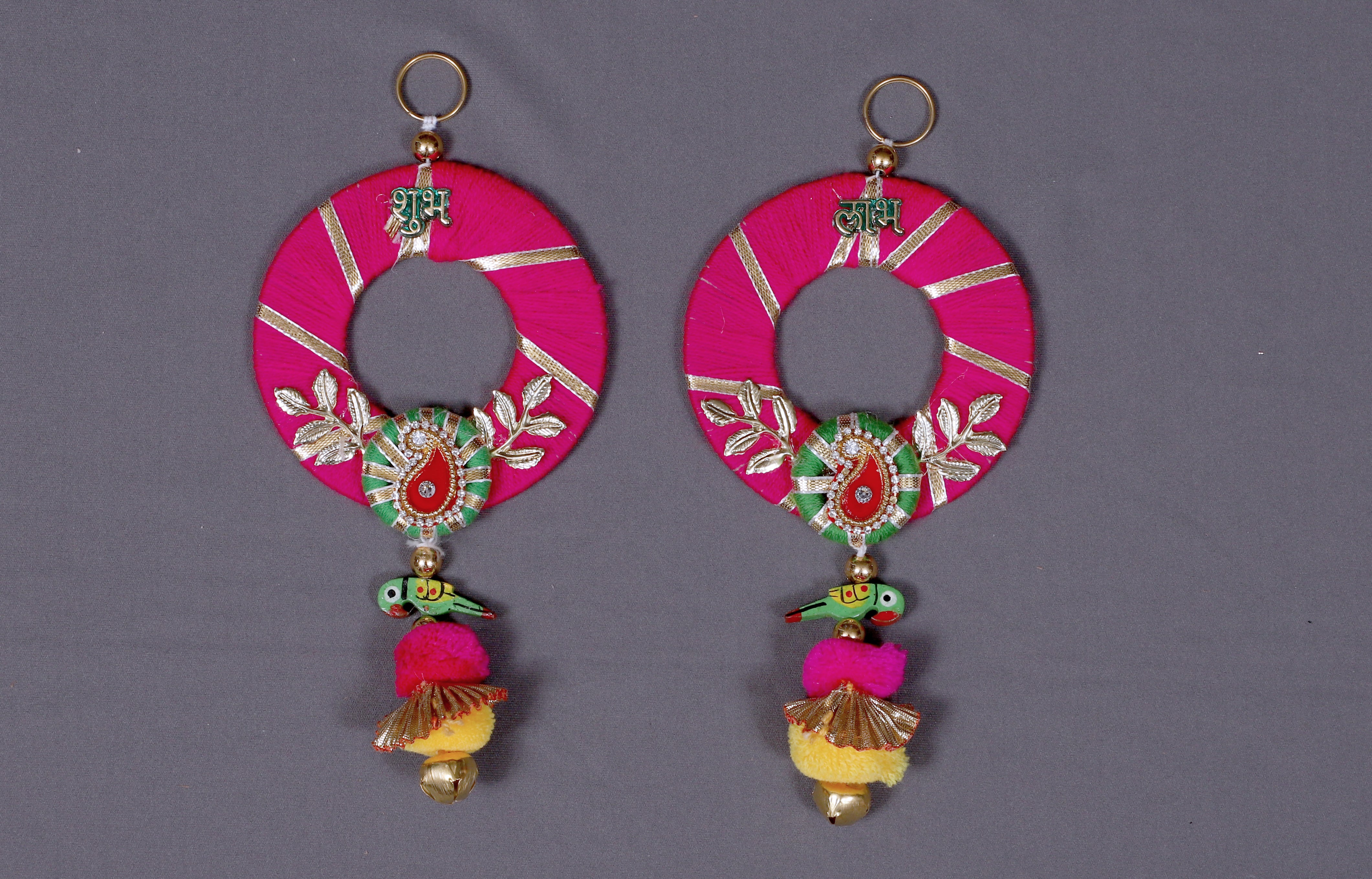 A decorative door hanging featuring a pink fabric wrapped rings adorned with paisley designs, shimmering gold accents and the auspicious word 'Shubh' and 'Labh'in Hindi
