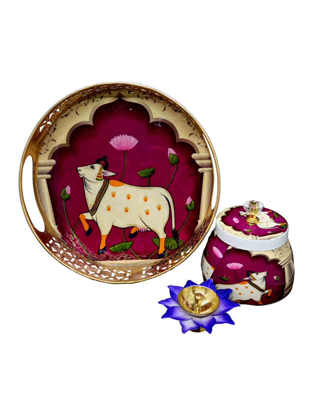Beautiful decorative tray of assorted colours depicting a cow in a traditional Indian design. Paired with a matching decorative jar and tealight