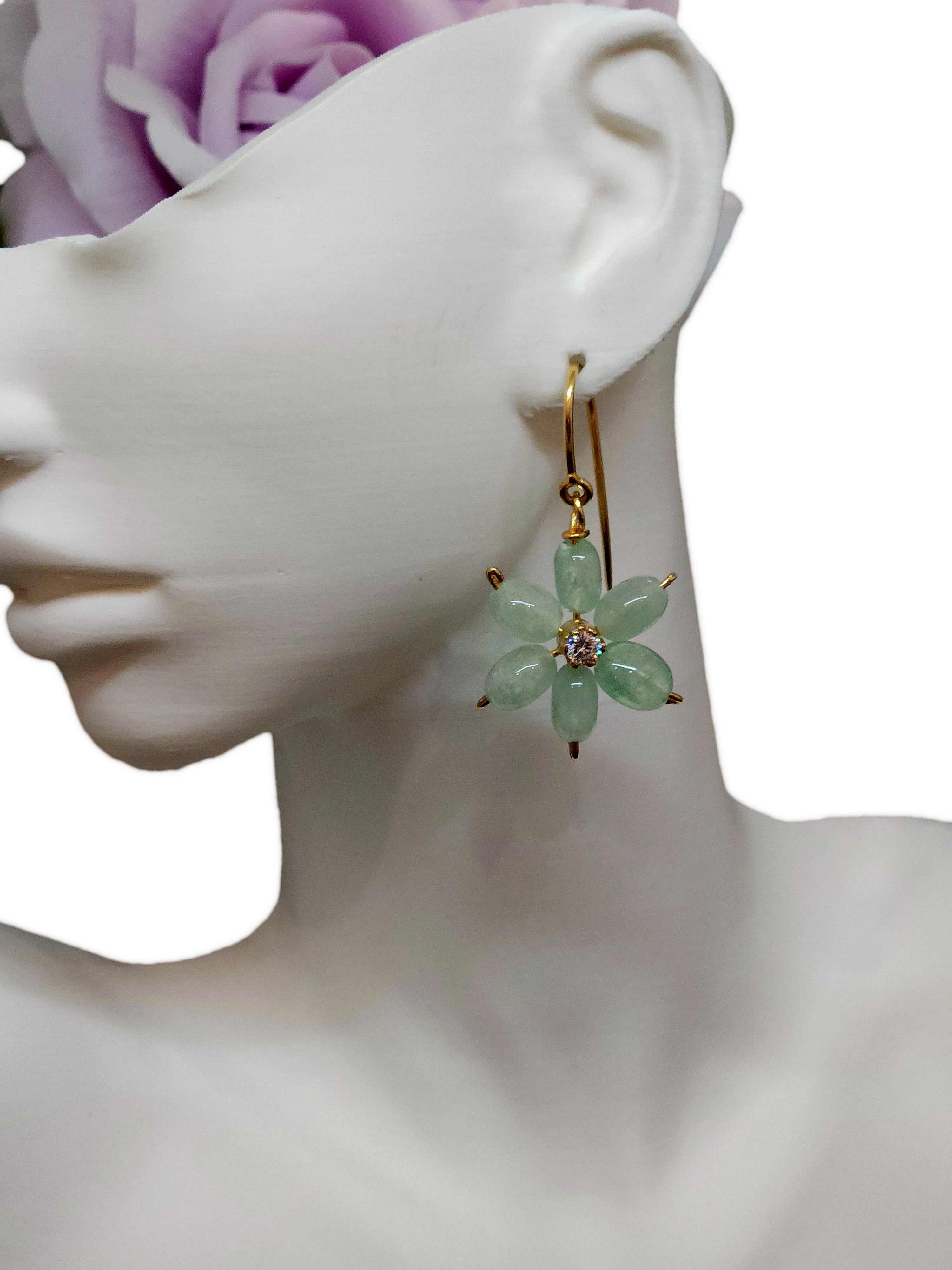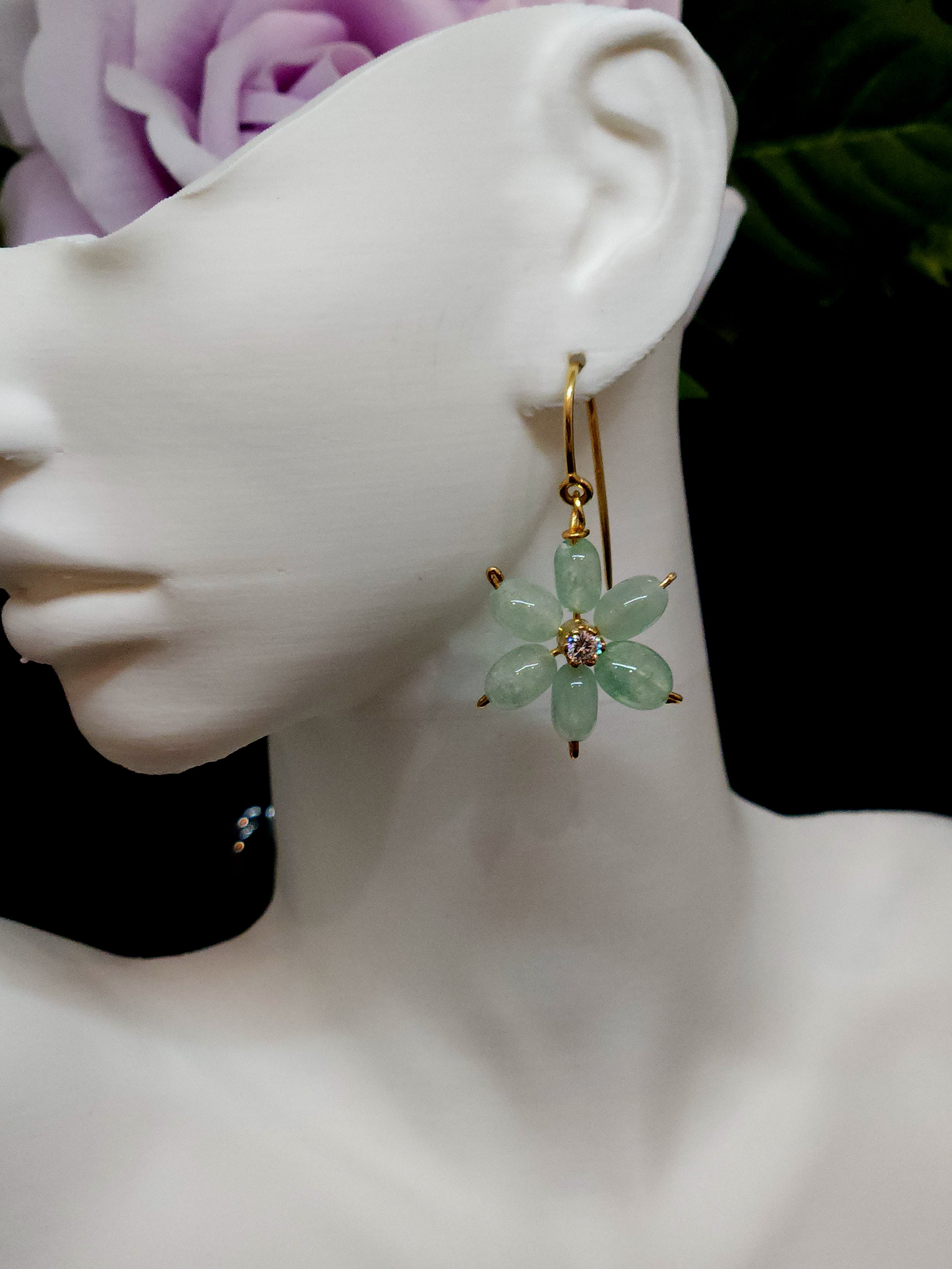 Delicate gold hook earrings showcasing a charming light green flower design with a subtle sparkling center.