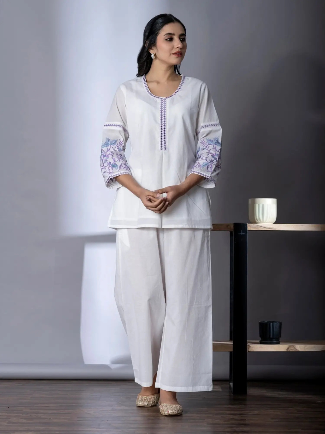 An elegant white kurta set features delicate embroidery on the sleeves and neckline, paired with comfortable matching trousers for a sophisticated yet relaxed look.