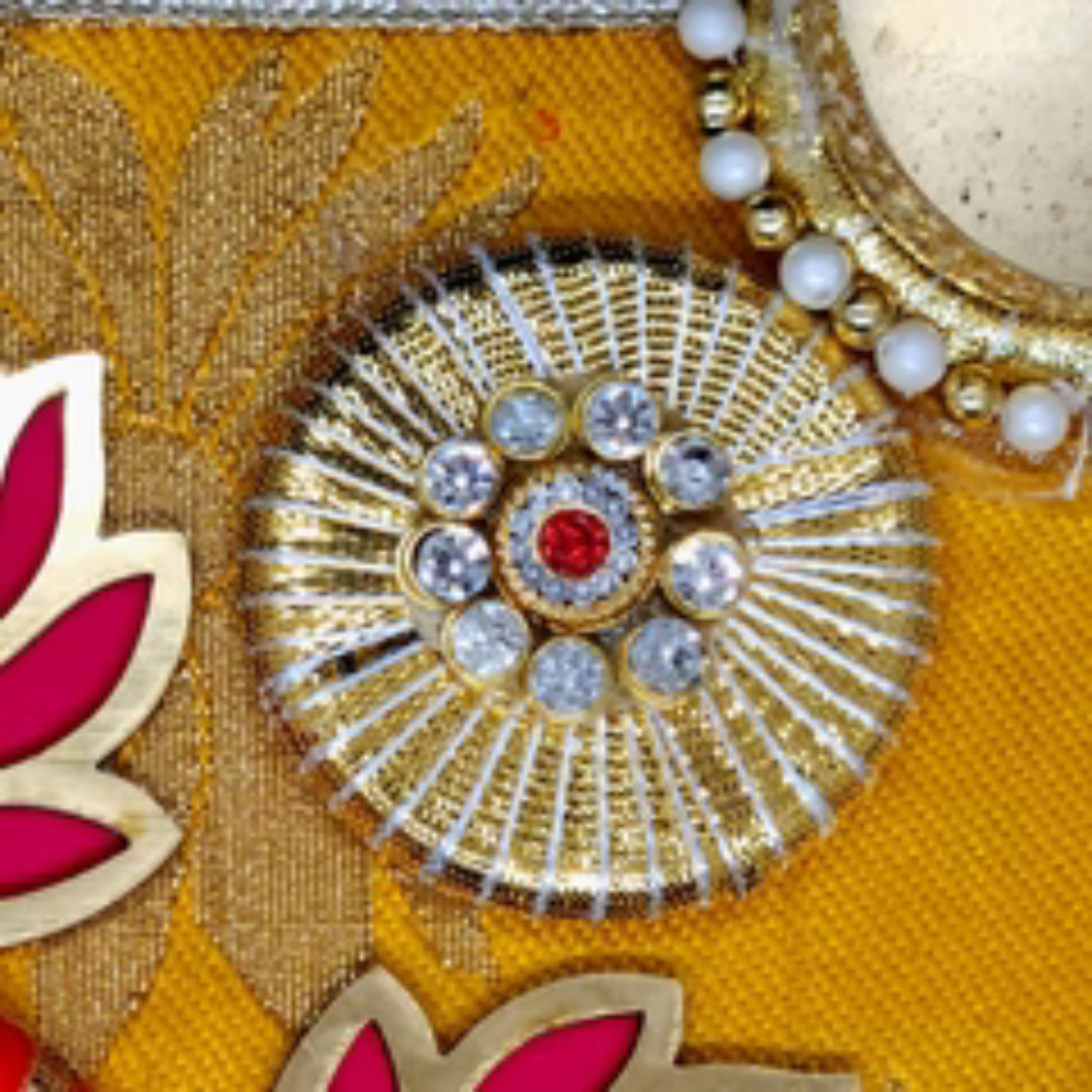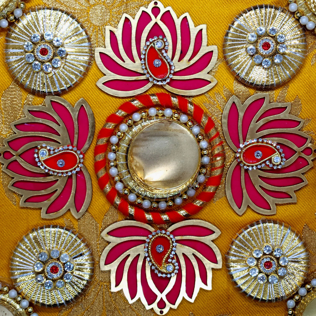 Beautiful tablemat with lotus designs and golden tealight holders surrounded by a beaded designs.