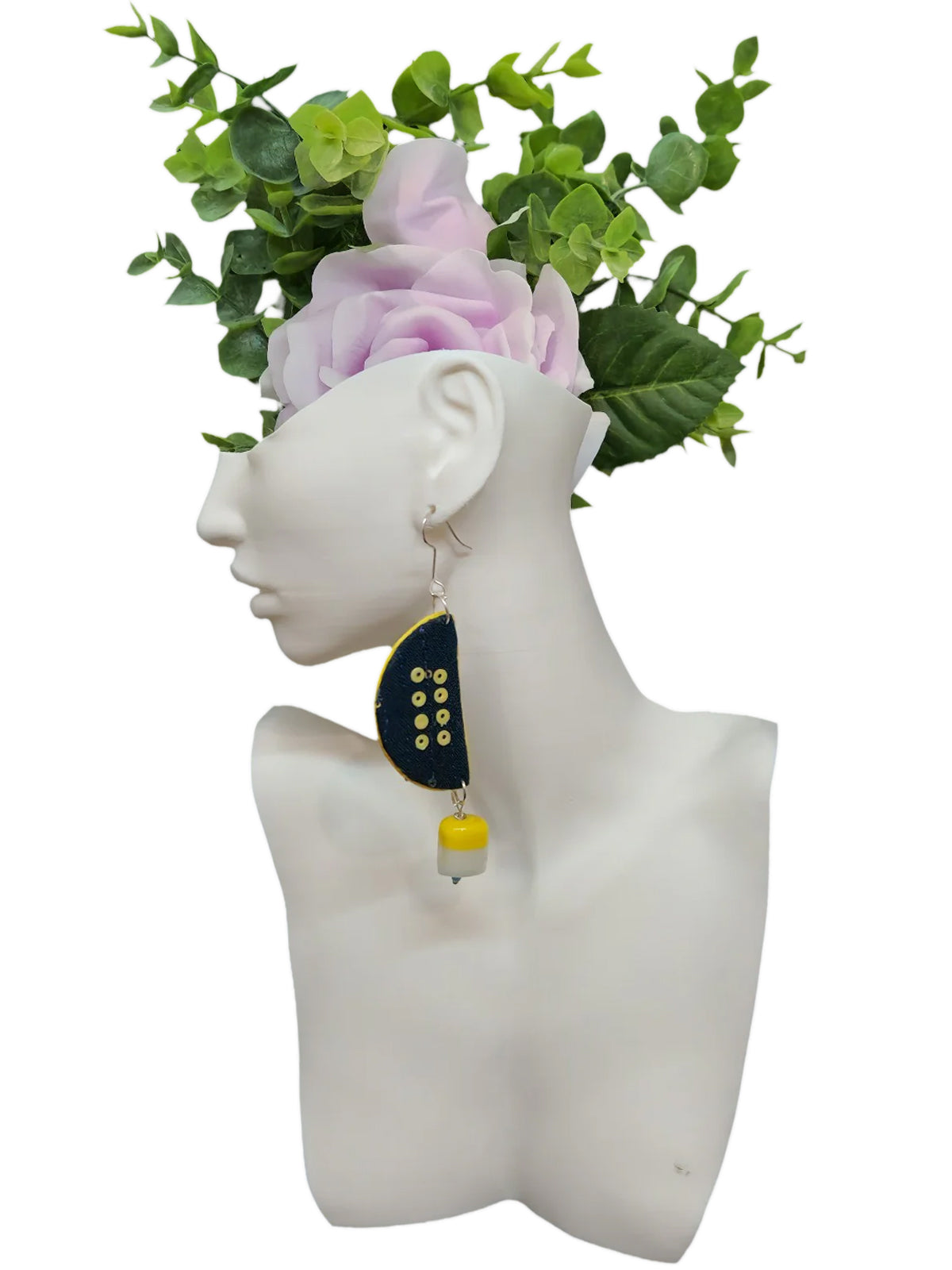 Abstract hook earrings with half-moon blue and yellow designs, featuring white beaded accents.