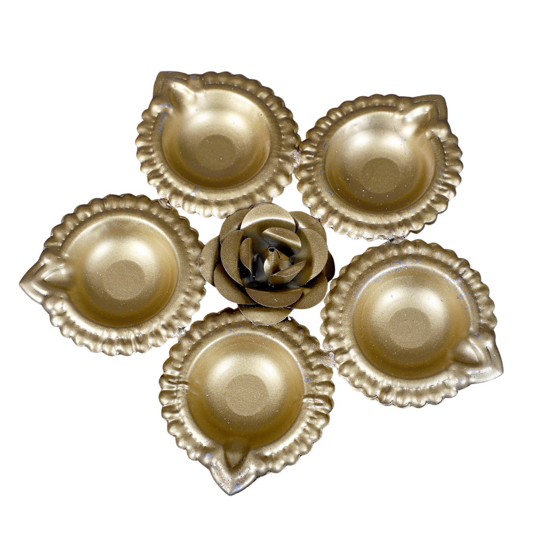 A golden hued metal diya arranged in a flower shape with a central rose accent making it perfect for a festive decor.