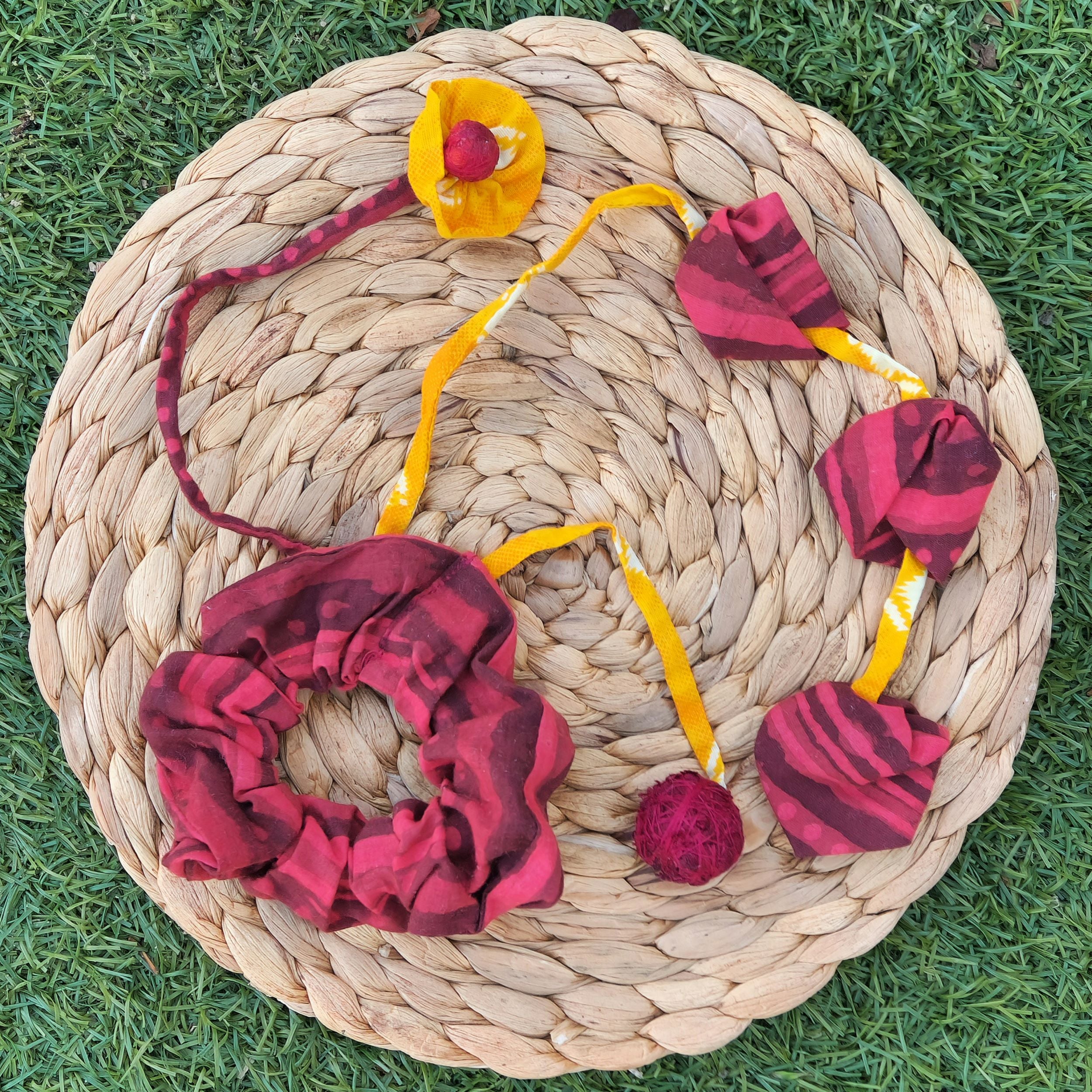 Brighten up your style with this bold handmade scrunchie. Featuring a deep red and maroon striped scrunchie paired with a playful charm strand, this set is the perfect mix of tradition and modern flair. The fabric charm strand includes red and yellow accents, adding a vibrant pop of color to your accessories. Soft Cotton, durable, and eco-friendly, this set is ideal for everyday wear or as a thoughtful gift..