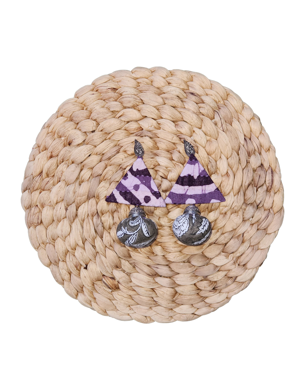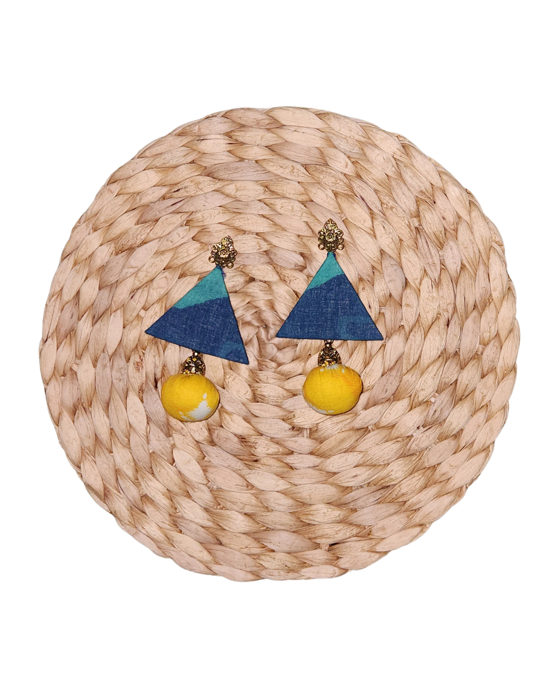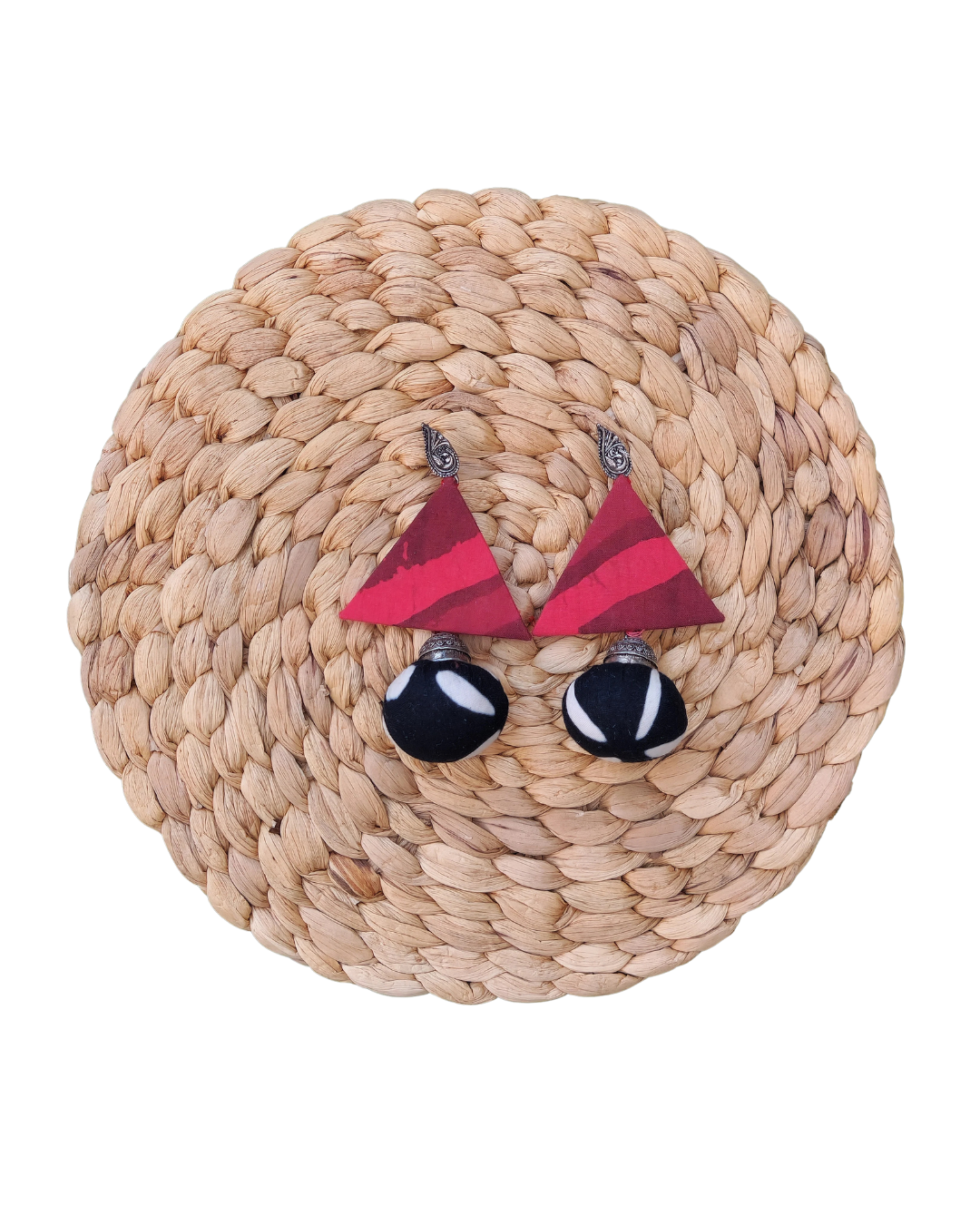Geometric fabric earrings with bold orange patterns and textured red accents.
