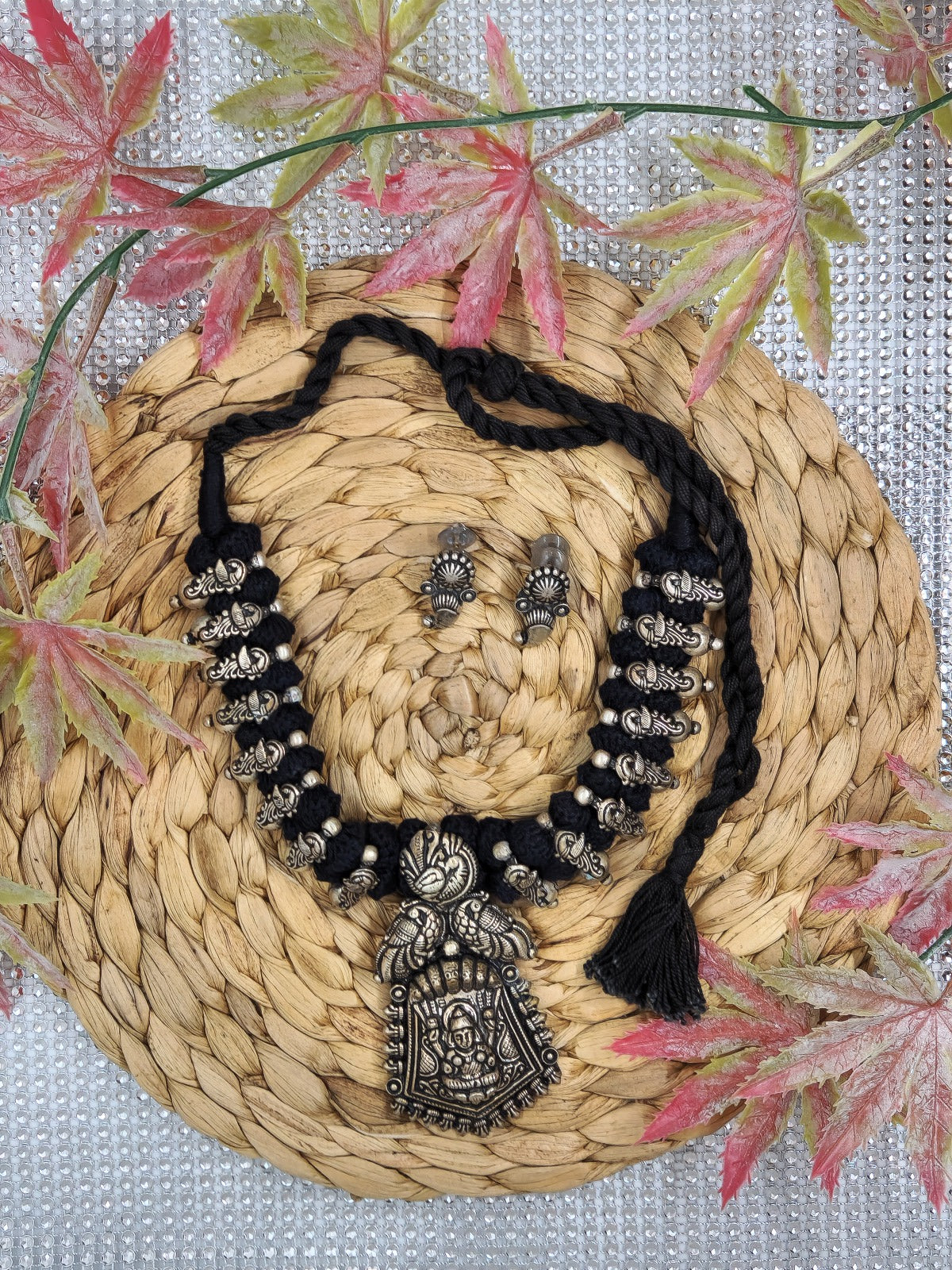 Black metal thread necklace set with oxidized German silver, featuring a detailed pendant and matching earrings.