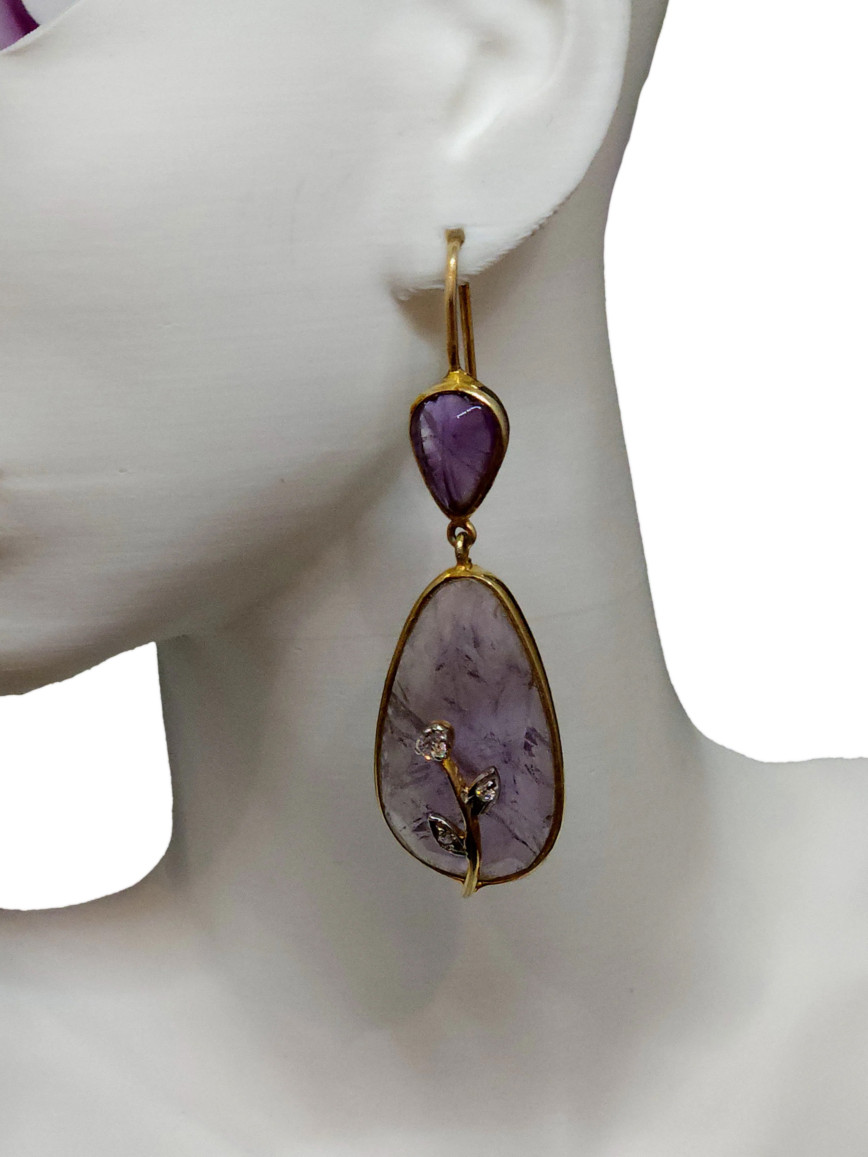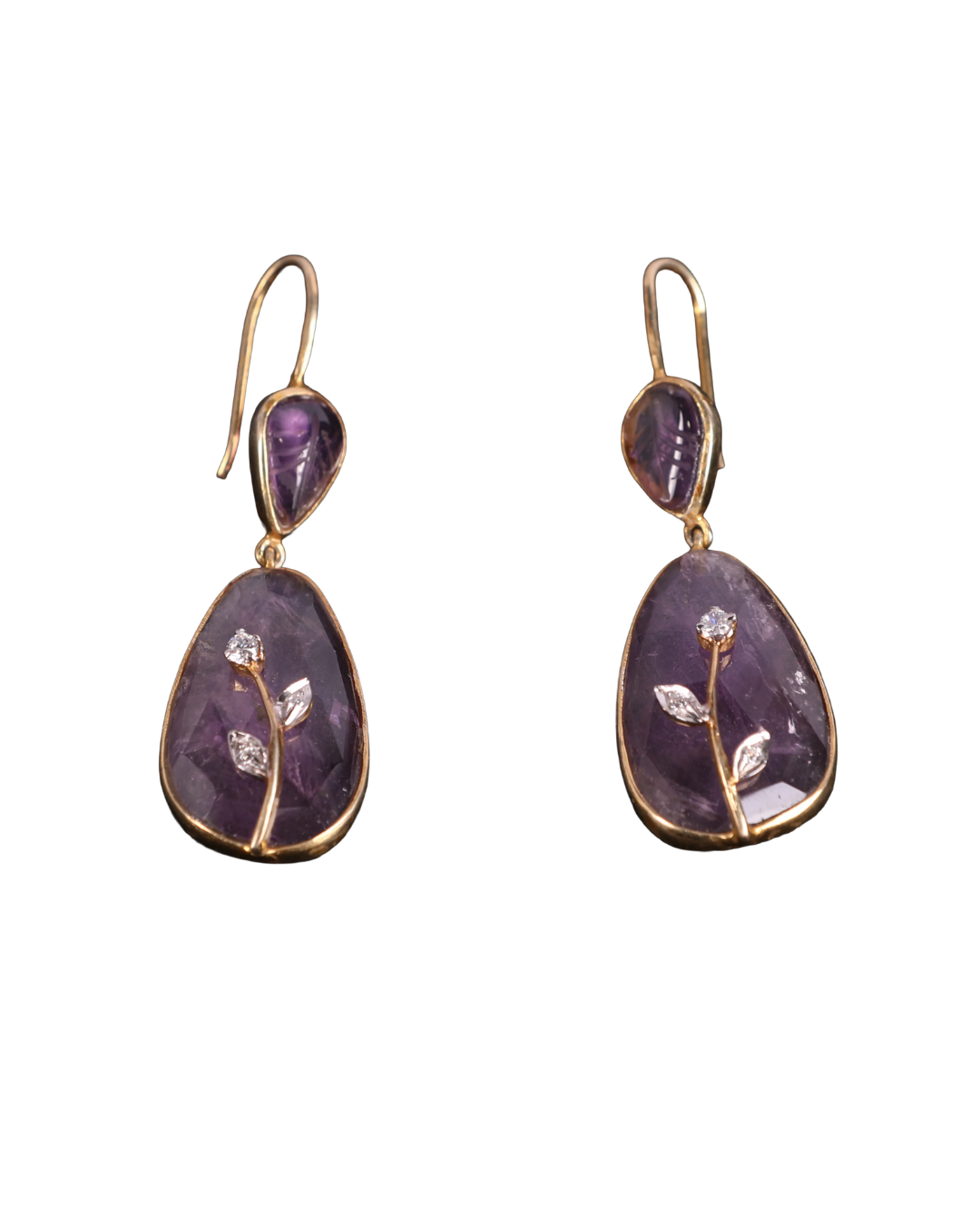 Exquisite gold drop earrings featuring two unique purple amethyst stones, ideal for a sophisticated look.