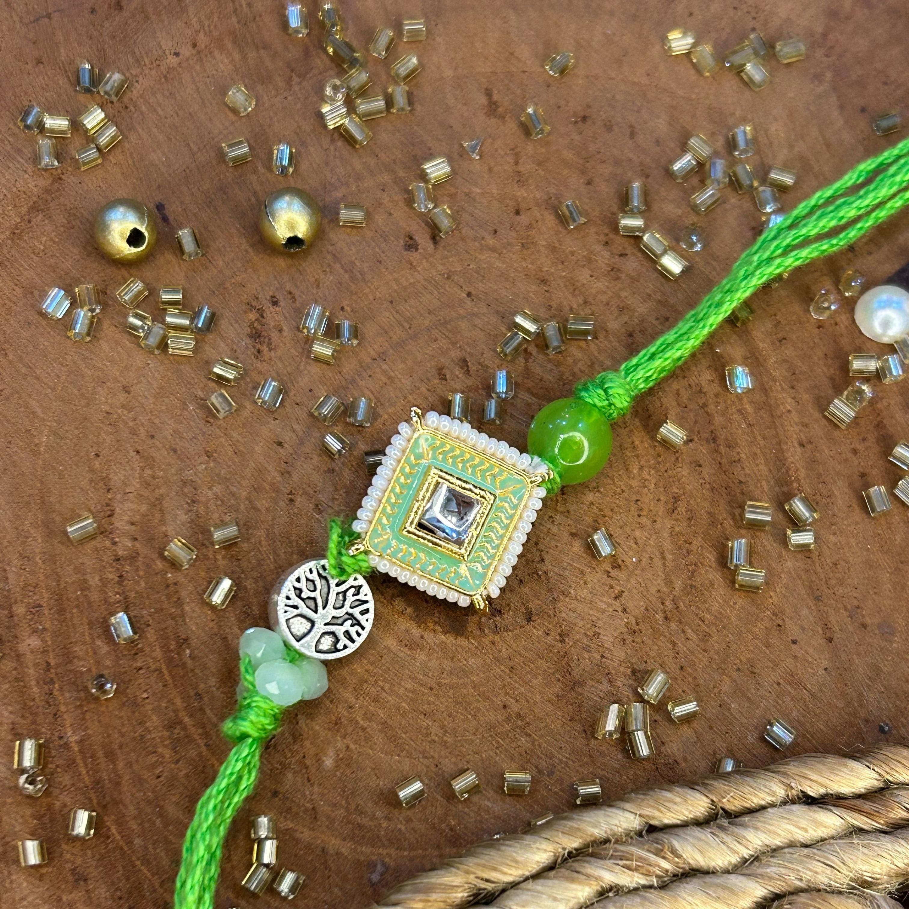 This delicate rakhi features a bright green thread, accented with a central square charm adorned with Meenakari work and Tree of Life charm, making it a unique design.