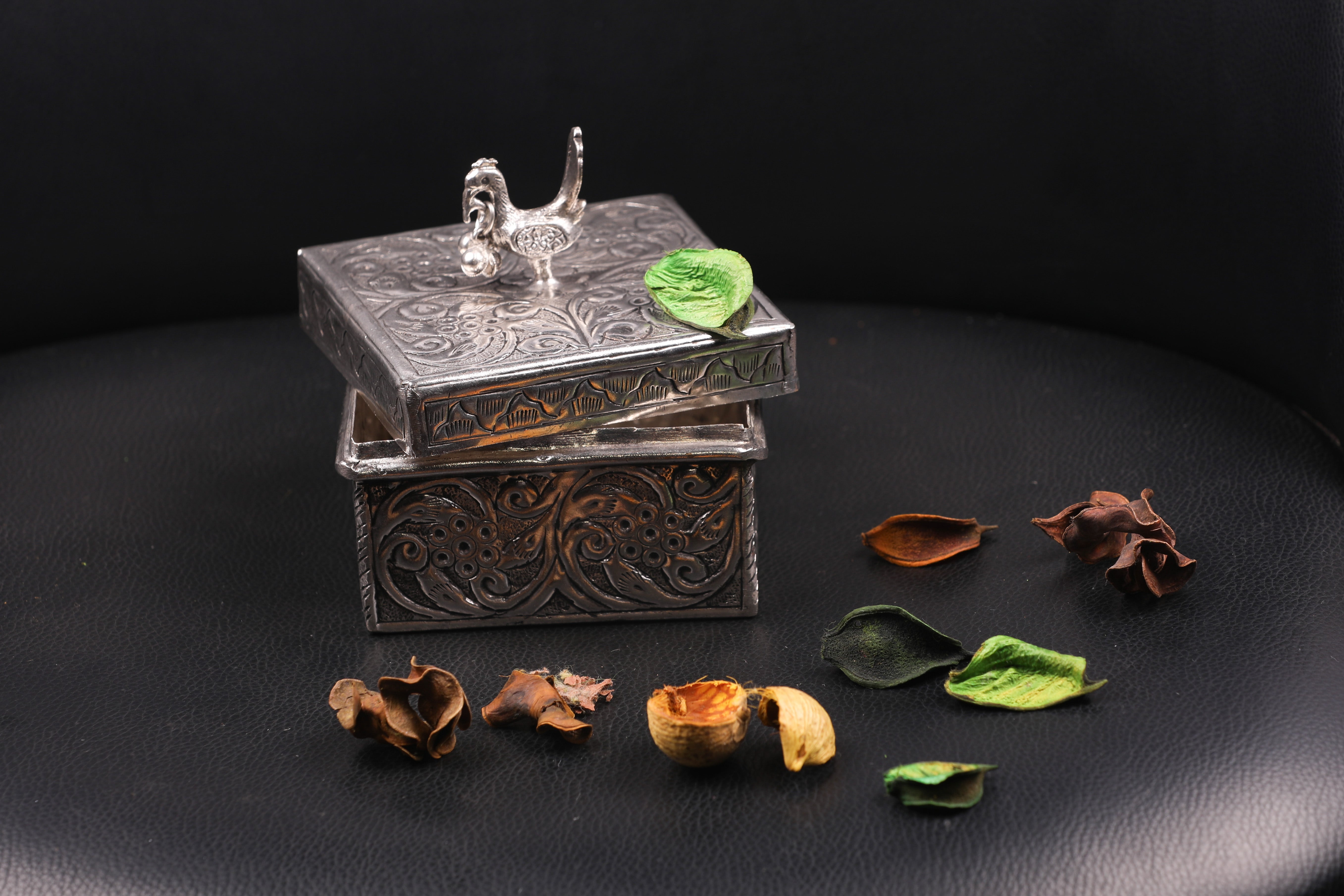 Beautiful Silver Box with a bird on the lid. Can be used for multiple purposes like poupourie or dry fruits.