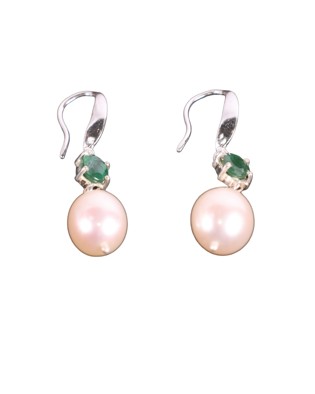 Elegant sterling silver hook earrings featuring a vibrant green emerald and a lustrous pearl drop.
