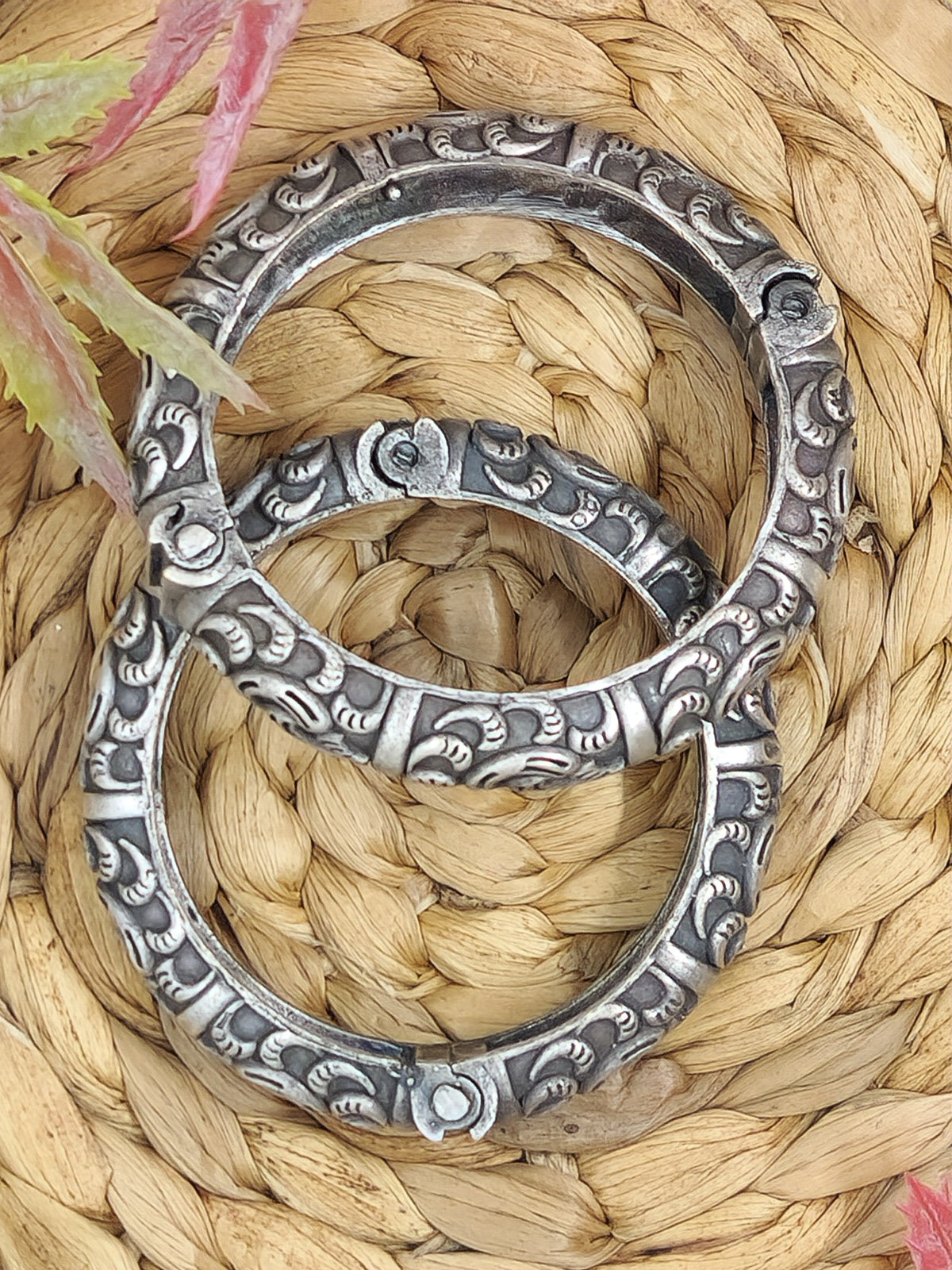 A pair of intricately carved silver-toned bangles with traditional designs, showcasing detailed craftsmanship.