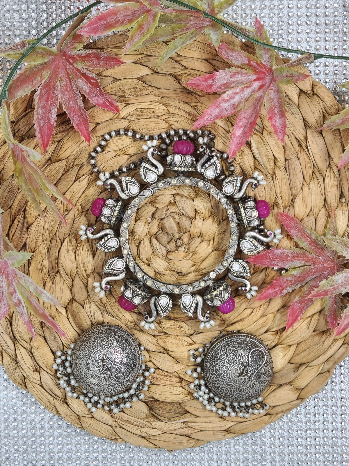 Elegant silver necklace with a unique, circular pendant featuring swan detailing and pink stone accents, plus matching earrings.