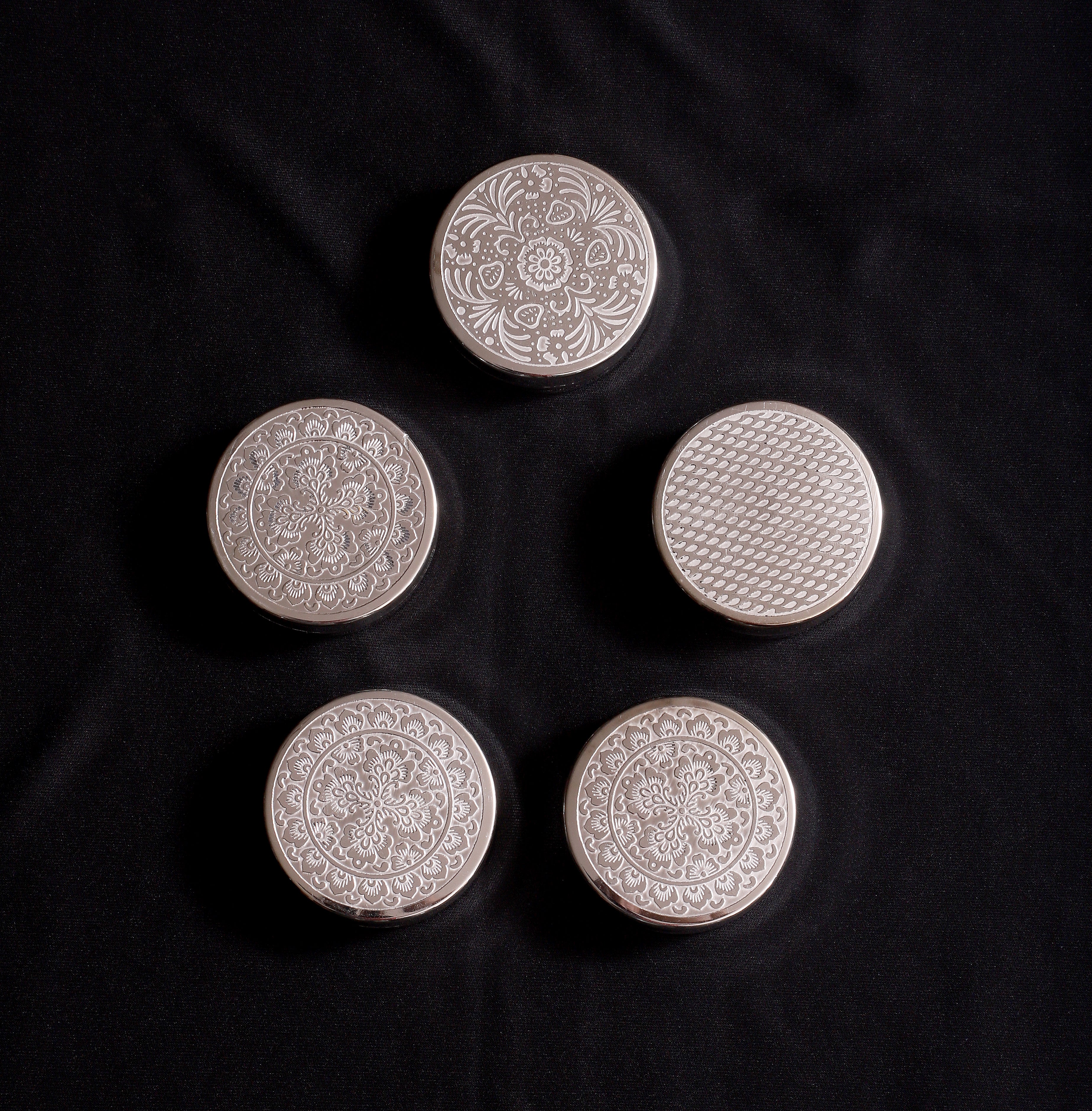 Beautifully crafted silver dibbis each adorned with intricate, unique floral and geometric patterns. Perfect for storing small treasures or adding an elegant touch to your décor.