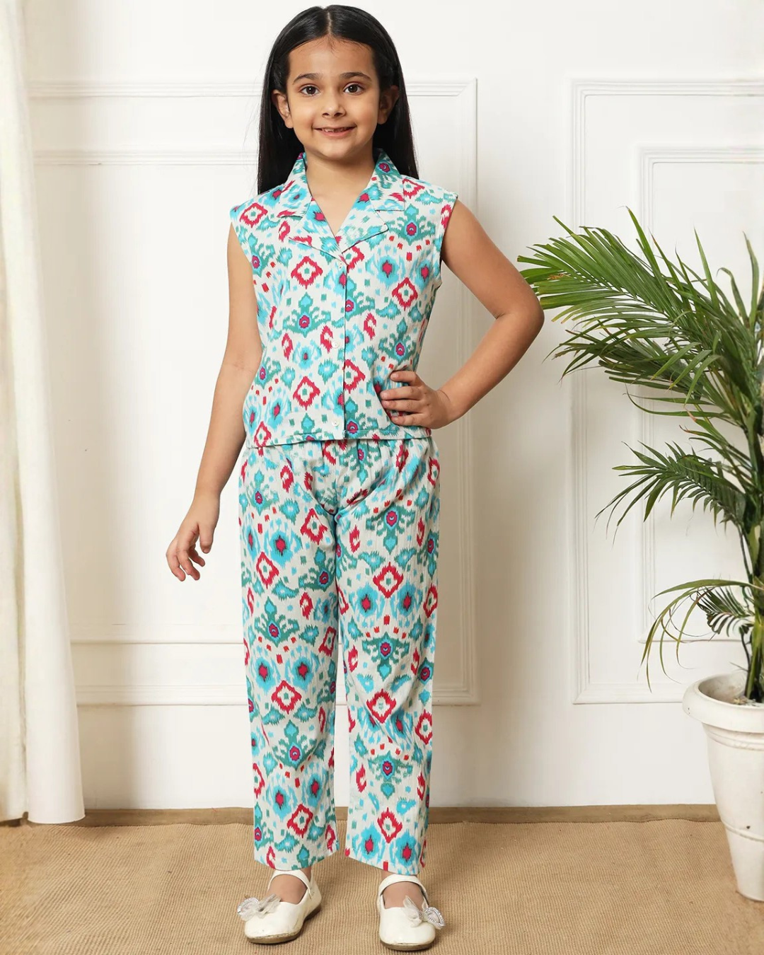 Bright, bold, and ready for adventure — this sleeveless multicolor printed coord is a fun must-have for every girl's wardrobe. Crafted from soft, breathable cotton, it features a collared neck, button-down front, and a cheerful floral-inspired print that stands out in every setting.