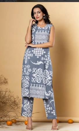 This sophisticated sleeveless kurta set features a tich purple hue with delicate white botanical prints, paired with coordinating wide-leg pants for a chic look.