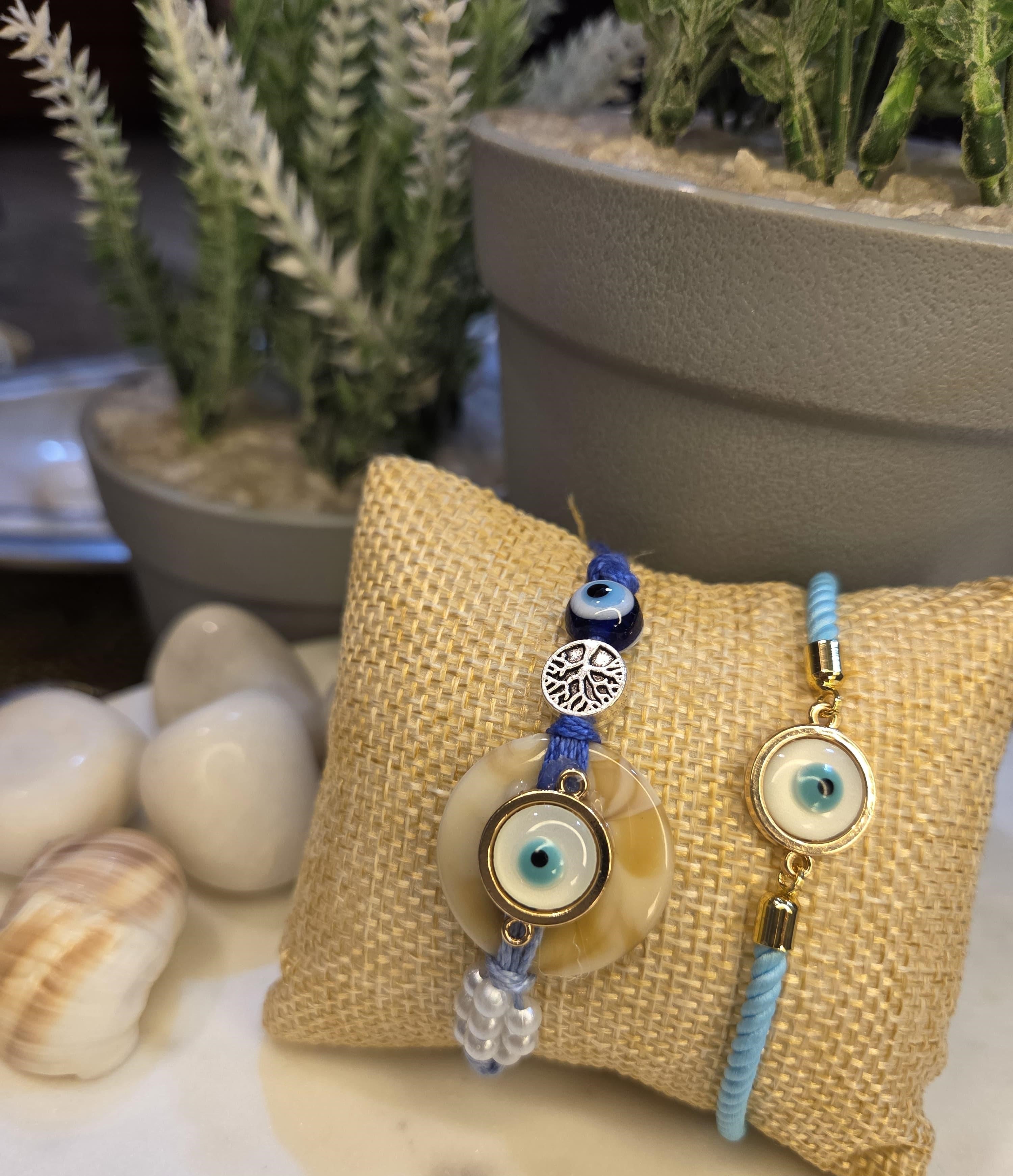Couples Rakhi Bracelet paired with beautiful evil eye charms combined with tree-of-life charm with pearls in a rope thread a unique gifting option.