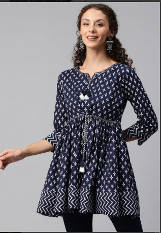 A stylish blue printed peplum kurta with a tie-up waist and playful tassel details, offering a modern, chic vibe.
