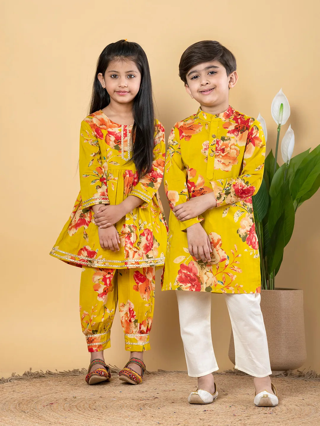 Light up any festive occasion with this radiant Sunshine Bloom sibling twinning set, crafted for picture-perfect sibling moments! Designed in a cheerful yellow base with eye-catching red floral prints, this set is made for celebrations, Rakhi rituals, and joyful gatherings.
