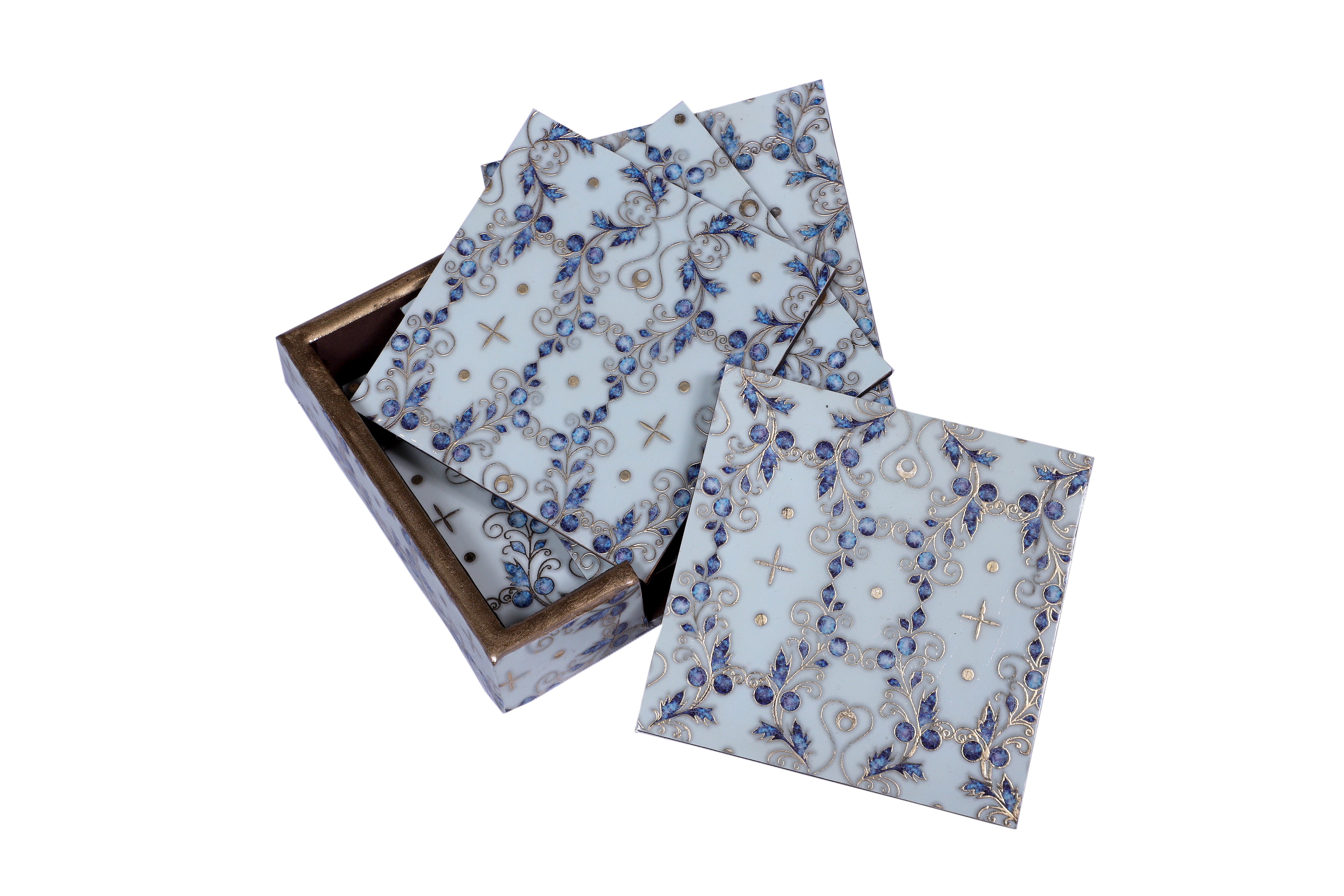 Protect your tabletops in style with this set of 6 elegant blue floral design coasters, each measuring 4" x 4". Crafted with attention to detail, these coasters bring a touch of sophistication and freshness to any dining or living space. Made from durable materials with a smooth finish, these coasters are perfect for safeguarding your surfaces from water rings, heat, and spills while adding a charming floral aesthetic to your home or office.