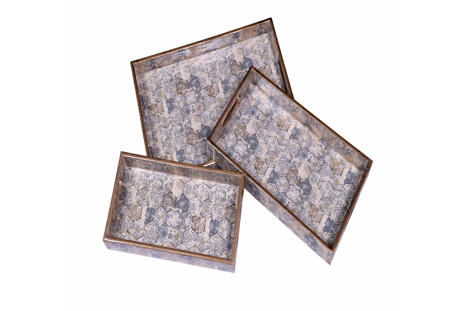 Antique elegance to your home with this handcrafted serving tray set. Designed with intricate hexagonal patterns, these trays showcase a perfect balance of tradition and modern sophistication.