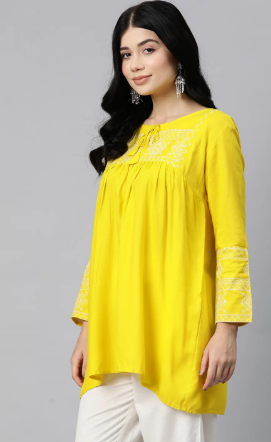 A bright yellow gathered kurta top with intricate front detailing, offering a relaxed and cheerful modern ethnic look.