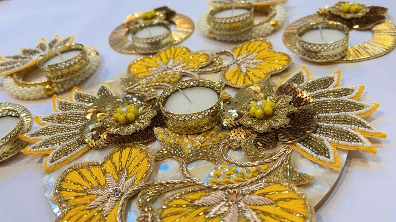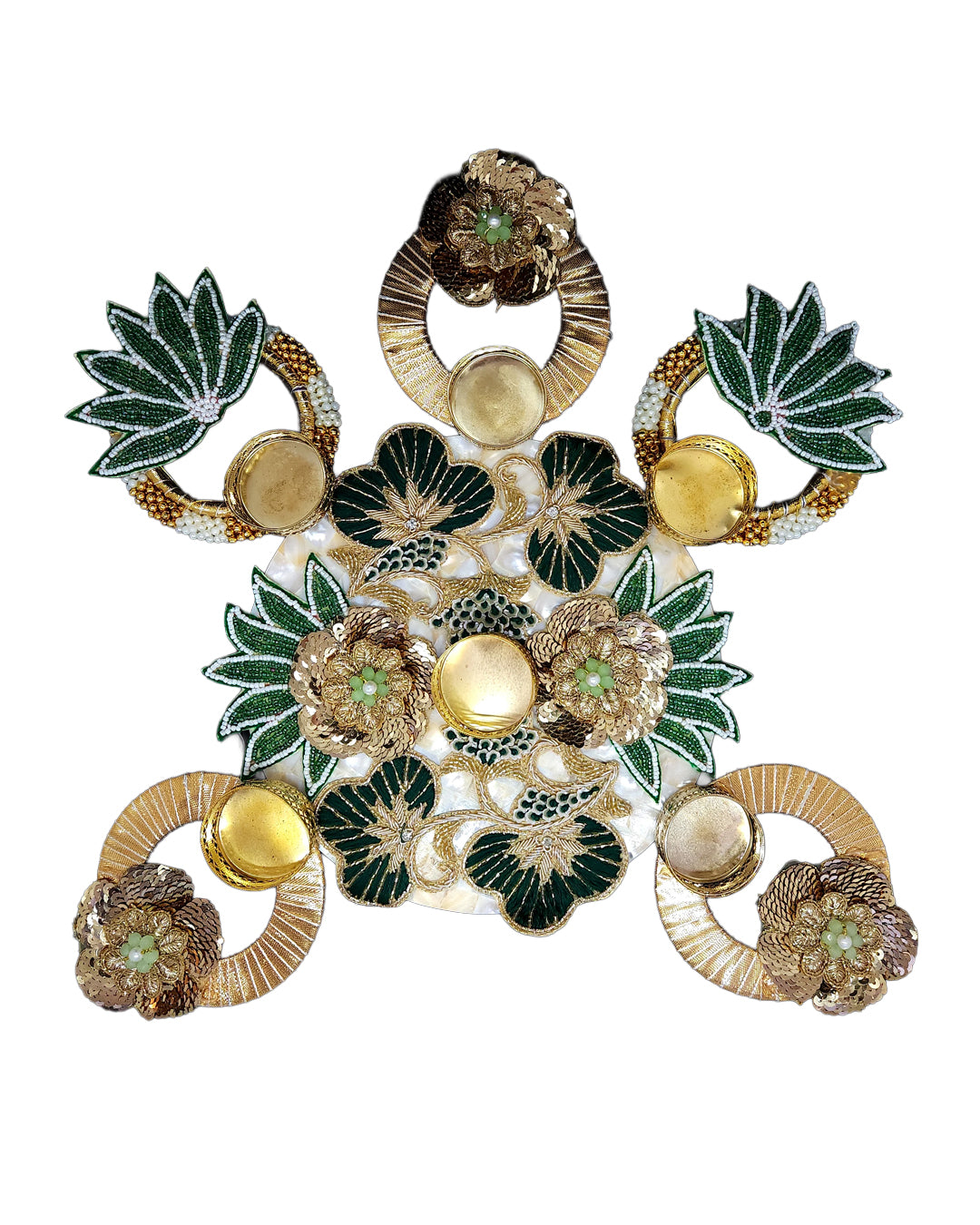 Bring a touch of luxury to your festive décor with this Zardosi Embroidery Decorative Rangoli featuring an elegant tea-light holder. Handcrafted with intricate Zardosi work, it adds sparkle and sophistication to your entrance, pooja area, or tabletop. Made from high-quality materials, this rangoli is durable and stylish, perfectly combining traditional artistry with modern functionality. Ideal for festivals, celebrations, or as a statement decorative piece.